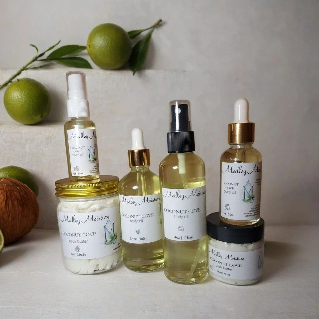 Includes: (1)3.4oz or 4oz body oil, (1)1oz body oil, (1)8oz body butter, & (1)2.5oz body butter