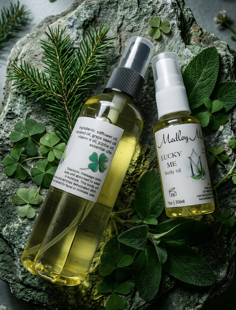 Lucky Me body oil is a lightweight botanical blend designed to deeply nourish the skin while leaving behind a clean, grounding scent of rosewood, pine, and patchouli.