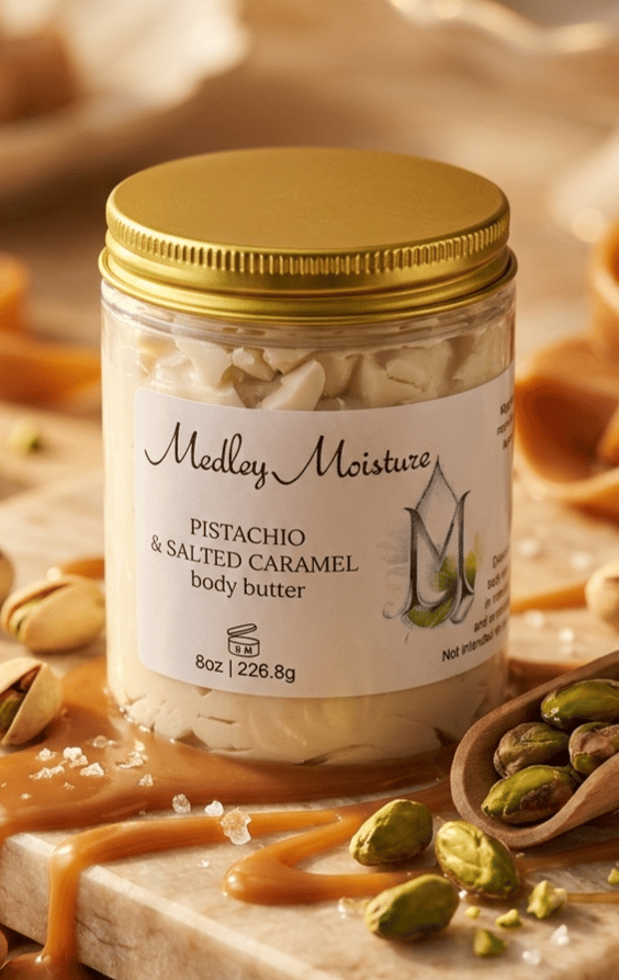 Our Pistachio & Salted Caramel Body Butter blends the warm, nutty aroma of roasted pistachio with the rich sweetness of salted caramel and soft creamy vanilla. The result is a scent that feels cozy, decadent, and irresistibly smooth.. like your favorite gourmet dessert, but made for your skin!